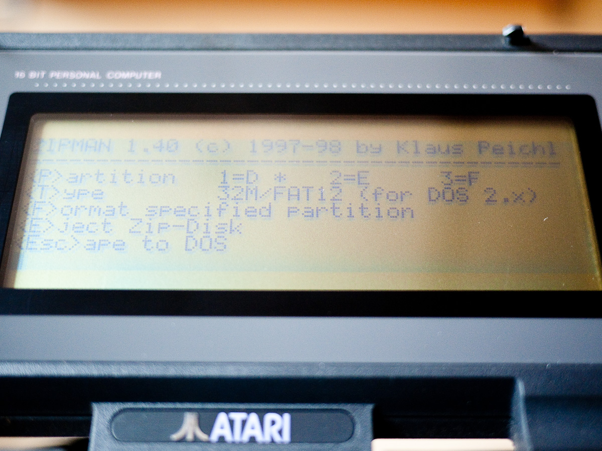 The first port of call then was Klaus Peichl’s site, Klaus developed the required driver, Pofozip.sys for the Atari and is still selling it for a very reasonable 8 €. A word of caution, the driver only works with the original Zip 100 parallel port drive, a later model was released which is not compatible. Klaus will kindly waive payment until you have things working, just in case you have a later drive. You’ll also need at the very least Zipman which will partition and format the zip disk in to three 32 Mb partitions, this can also be downloaded from Klaus’s site long with a couple of other utilities.