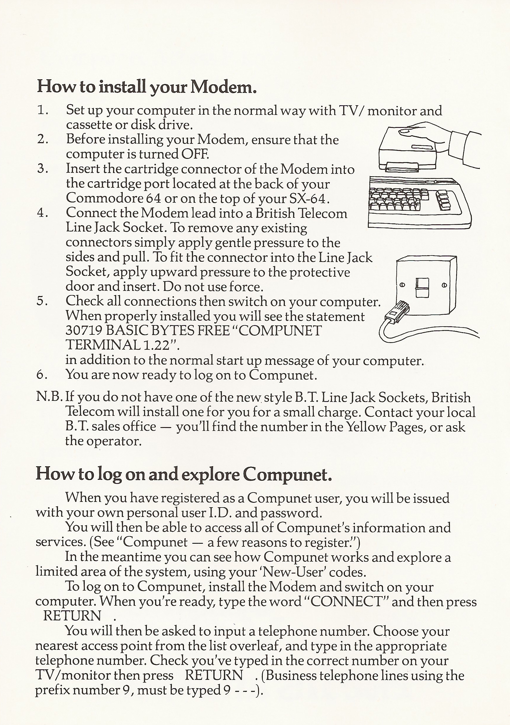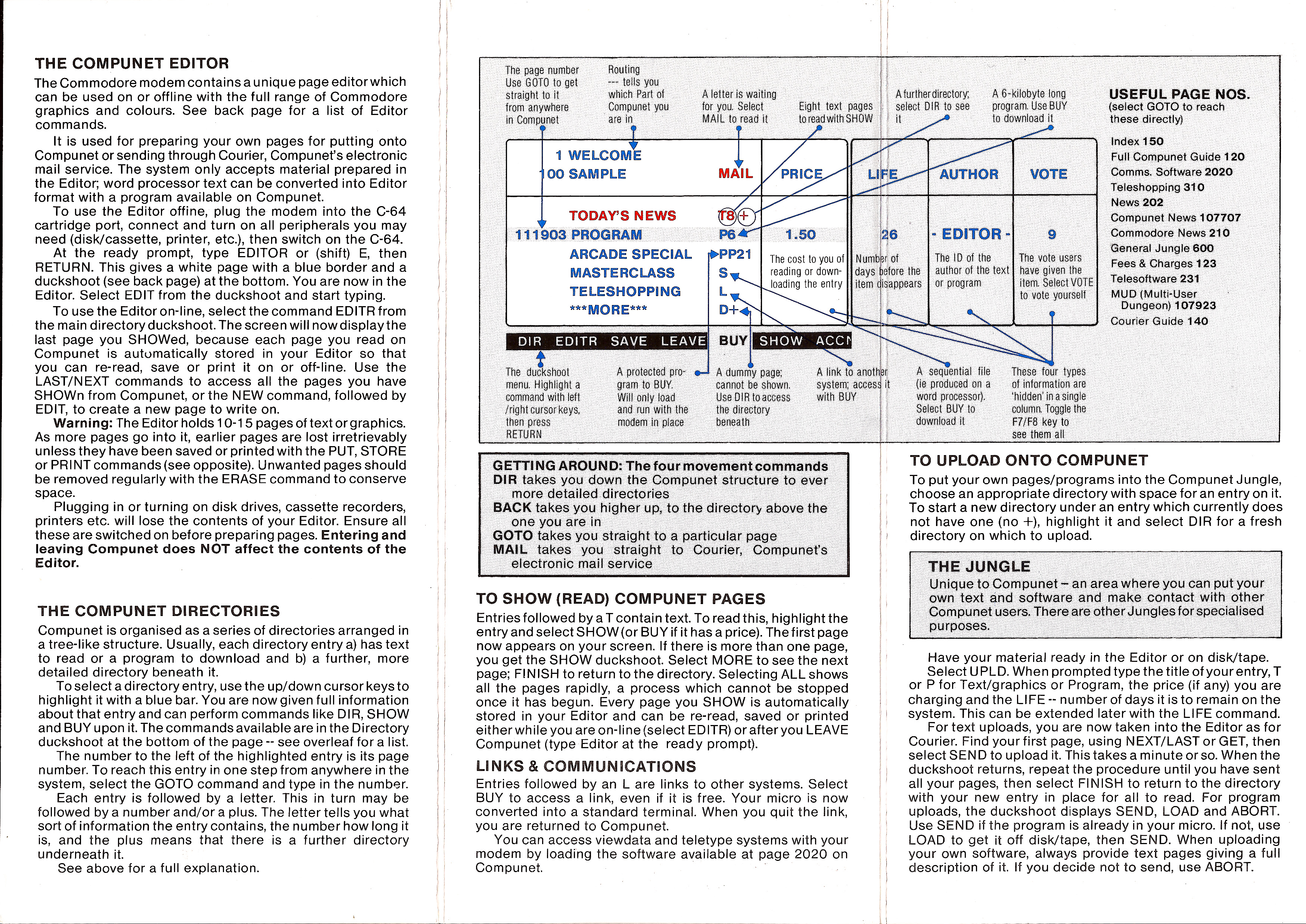 The vast majority of users accessed Compunet with a Commodore 64 and Commodore Communications Modem, the latter of which contained a built-in text and low resolution graphic editor. These allowed you to create content offline before uploading, thus saving on expensive phone charges. Latterly the service would also see users logging on with Amigas and even Atari STs.