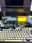 The FDD is an Epson SMD-400. Like the HDD it has a non-standard connection, with power being supplied via the interface cable as opposed to the usual separate cable. Unlike the HDD it doesn’t work and I’ve been unable to make it read or write to any disks. I’ve had it apart and fiddled a bit with the spin speed and head alignment but no joy. Oddly a cable to nowhere has been soldered to the board, I have no idea what it would have been connected to but hope it’s not something painfully obvious like the head.