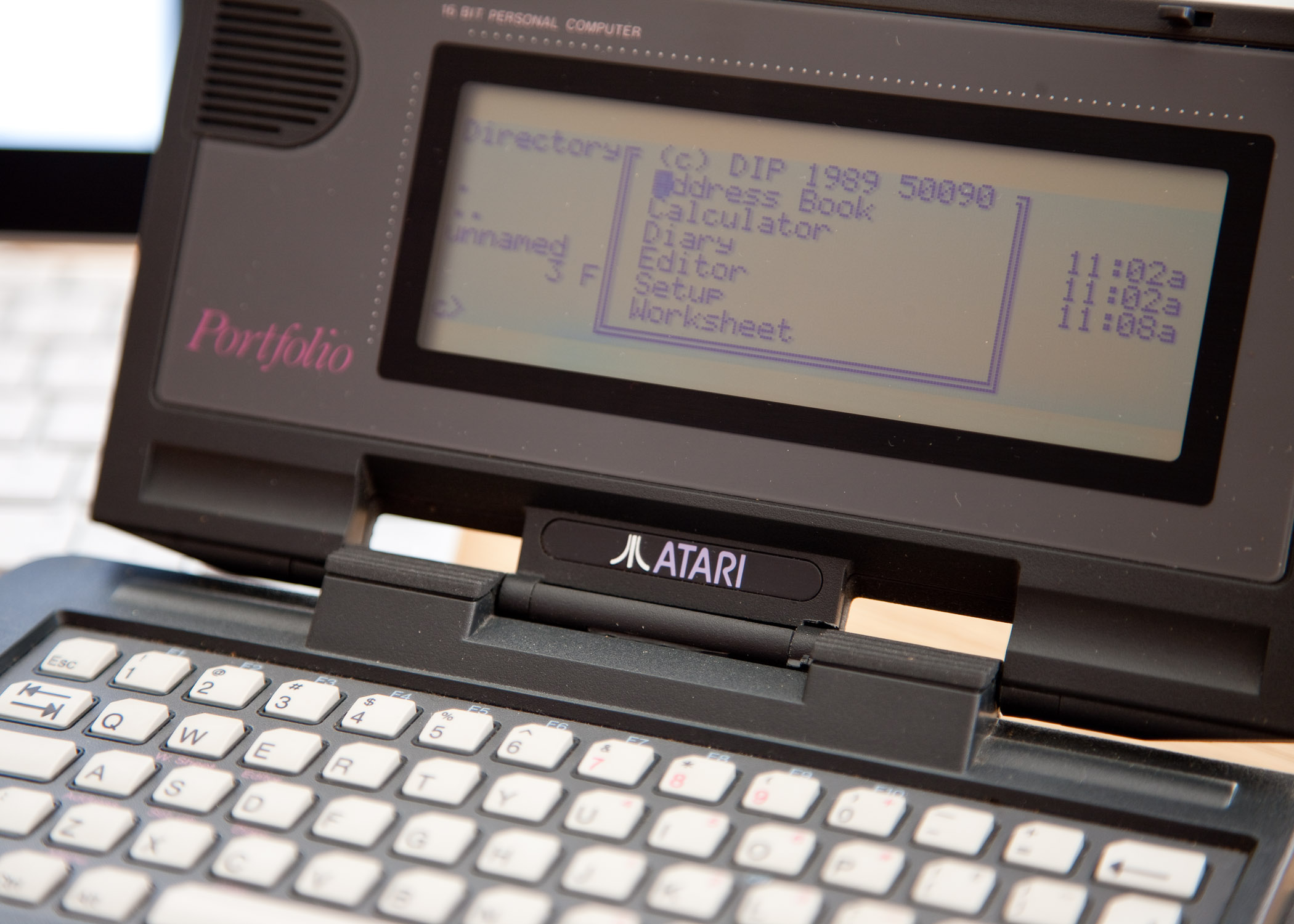 My Atari Portfolio has arrived, and what a gorgeous little thing it is indeed. I took some pictures and thought it would be interesting to include my iPad in the background. I promise I’m not neglecting my PX-8, but it’s at work as I have a Win95 box there. I will bring it home soon and take some pictures.