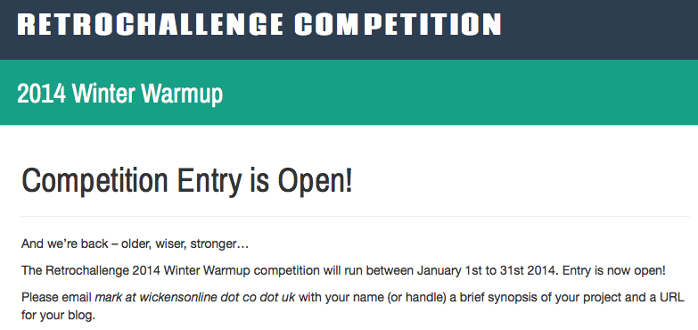 Entry for the Retrochallenge 2014 Winter Warmup in now open. Why not head over the to the retrochallenge website and register to participate. Whatever you have in mind, a grand design or simply tinkering with vintage gear, you can decide your own challenge and dictate your own pace.