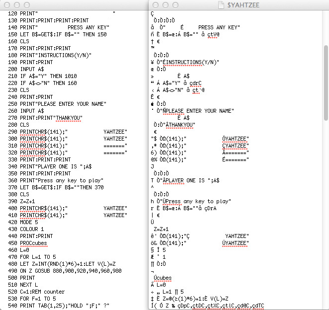 Loading these into a text editor revealed that they were BBC BASIC programs, namely my game ‘Yahtzee!’ and Urbancamo’s ‘Airman’. Not exactly Prince of Persia but nevertheless pretty exciting on a personal level to recover such data from a disk that is the best part of 30 years old and has spent most of its life suffering the extreme temperatures of life in the loft.